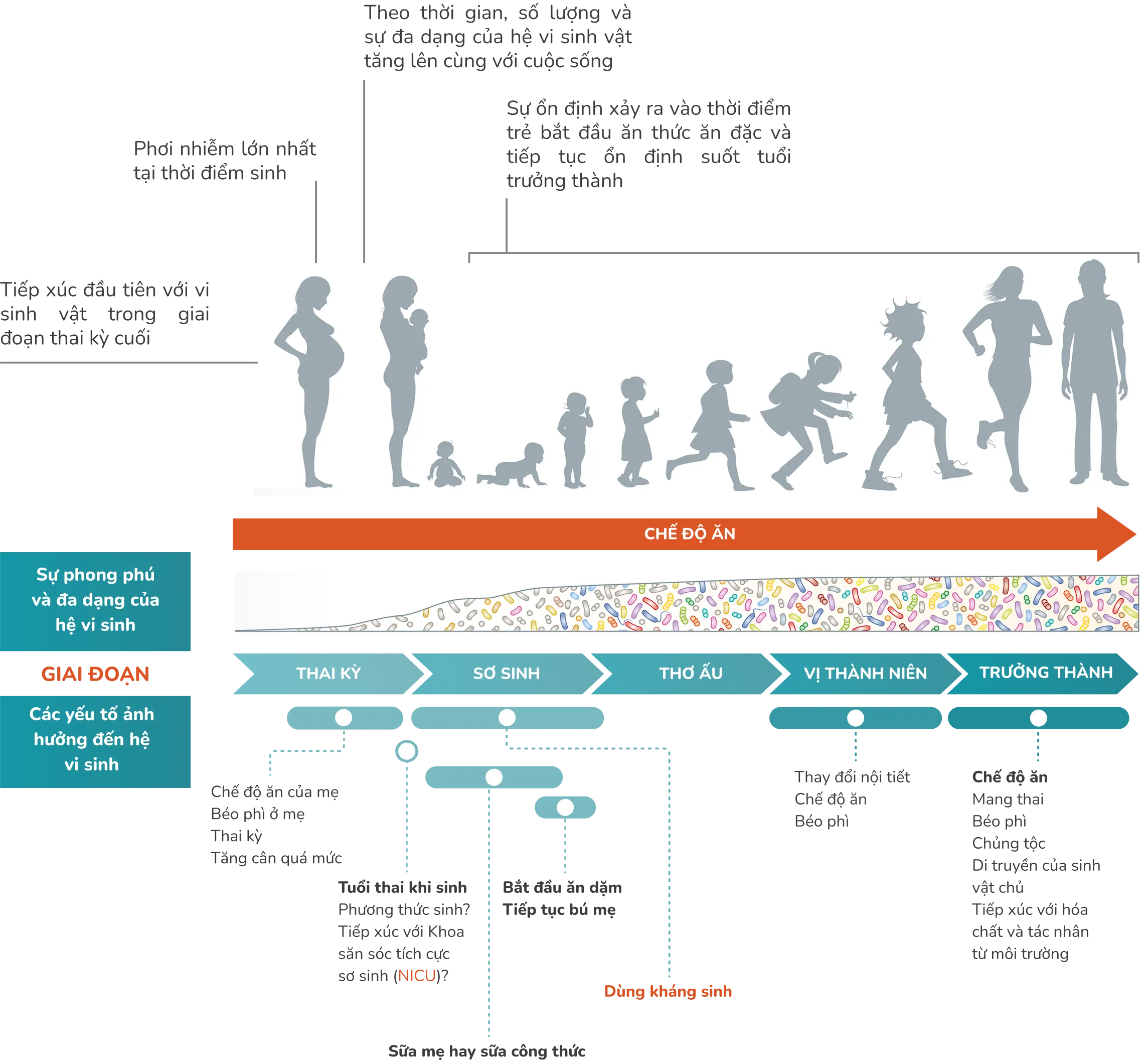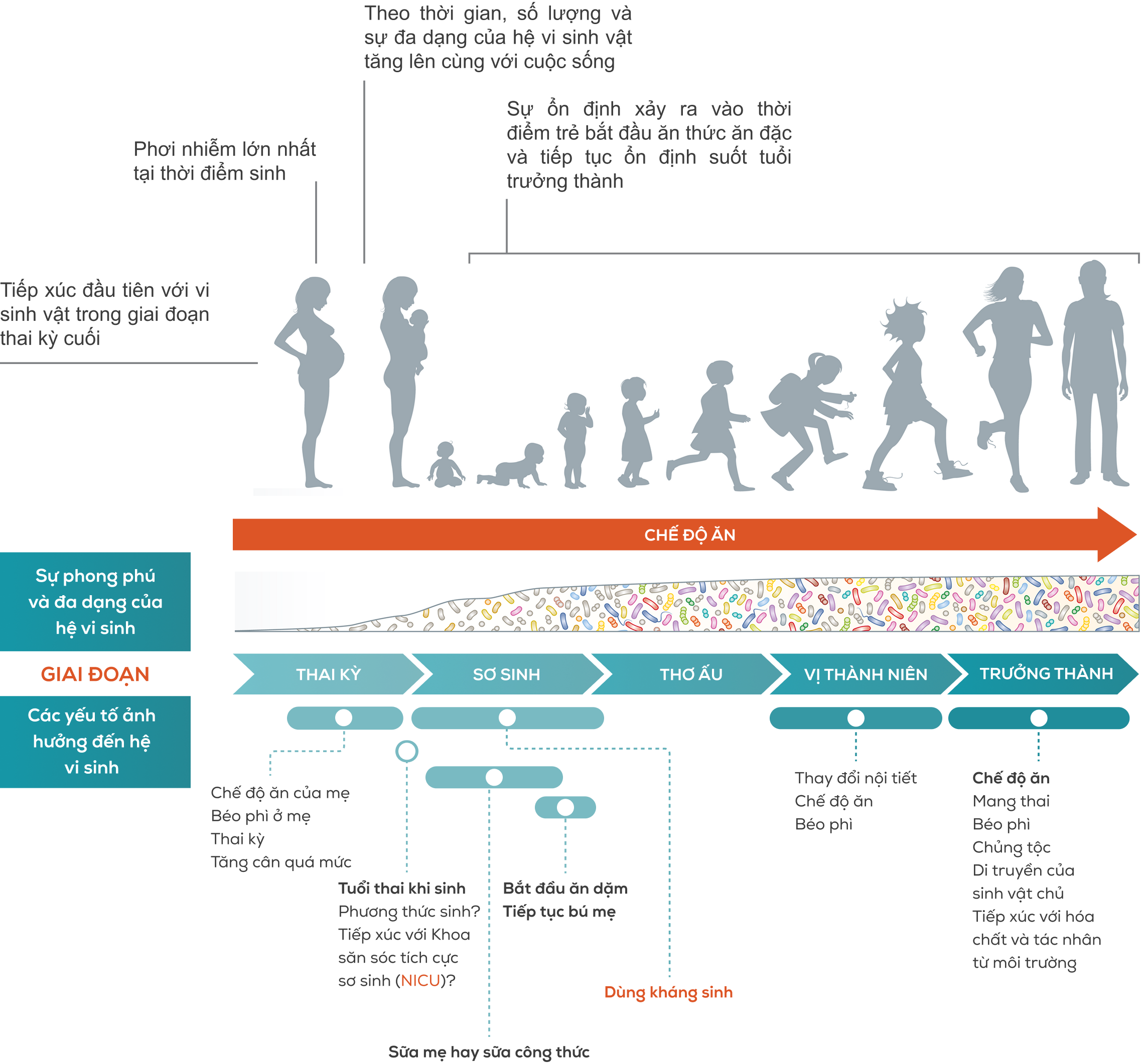 Gồm vi sinh vật, hệ gene của chúng và các điều kiện môi trường sống xung quanh chúng.5 Nhiều yếu tố được cho là có vai trò ảnh hưởng lớn trong việc định hình tính đa dạng và số lượng hệ vi sinh vật đường ruột ở trẻ sơ sinh trong suốt cuộc đời.6,7